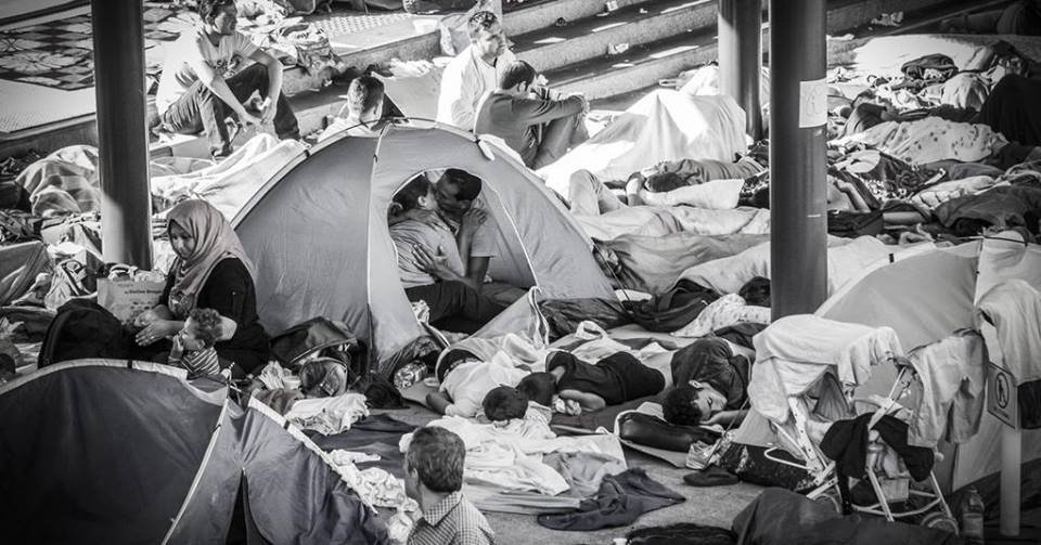 El beso de una pareja de refugiados sirios en un campamento improvisado al lado de la estación de tren Keleti en Budapest. Fotógrafo: Zsíros István.